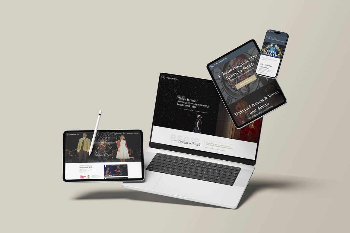 Tobias Ribitzki benötigt eine Website, die seine Arbeit als Regisseur für Musiktheater sichtbar macht und dokumentiert. Das Designkonzept ist gewünscht klassisch-modern: Moderne Typografie trifft auf ein schlicht klassisch-elegantes Logo. Die prägende blaue Farbpalette unterstreicht Ribitzkis Kompetenz, Kreativität und Seriosität, während zugleich großzügiger Raum für die Wirkung jeder einzelnen Inszenierung bleibt.